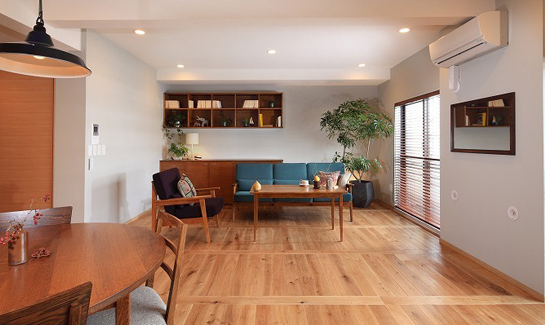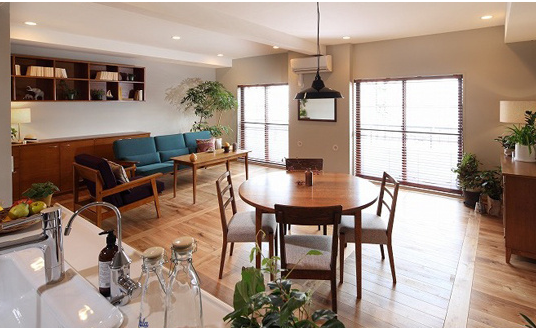 【改造要點(diǎn)2】木質(zhì)的地板與木質(zhì)的家具相搭配,整體顯得非常協(xié)調(diào)。長方形的木質(zhì)茶幾,展示出濃郁的日式恬淡。幾株綠色植物,帶來了一抹大自然的氣息。